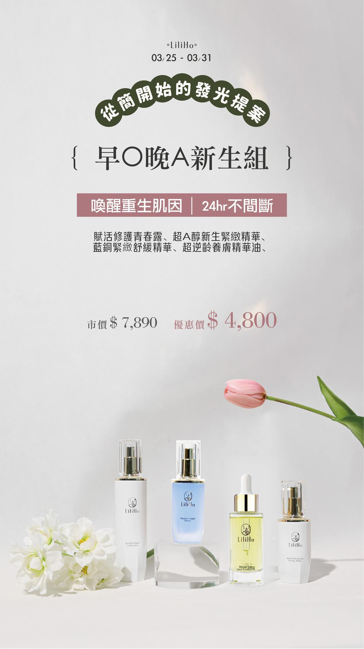 『早O晚A新生組』賦活修護青春露、超A醇新生緊緻精華、 藍銅緊緻舒緩精華、超逆齡養膚精華油